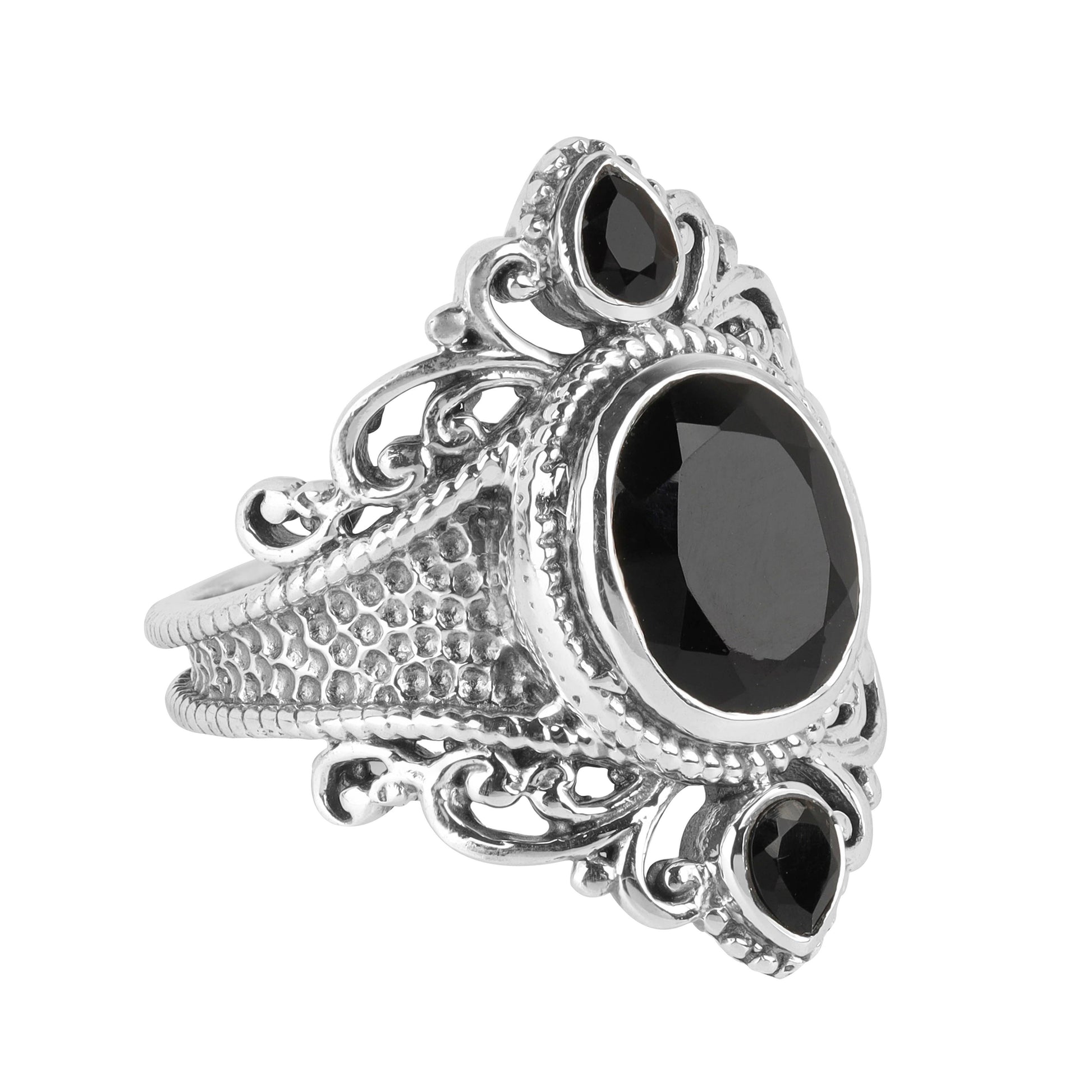 Command attention with the Midnight Sovereign, a regal composition of silver and shadow. At its heart lies a faceted oval black onyx gemstone—deep as obsidian, bold as a vow—framed by scrollwork that whispers of forgotten empires. Two companion stones, one teardrop and one round, nestle into the design like secrets kept close: each cut to catch the light and hold it captive. The silver band, textured and intricate, wraps the finger in a tapestry of craftsmanship, balancing drama with elegance. This ring is not worn—it is declared. Perfect for those who speak in silences and shimmer in mystery.