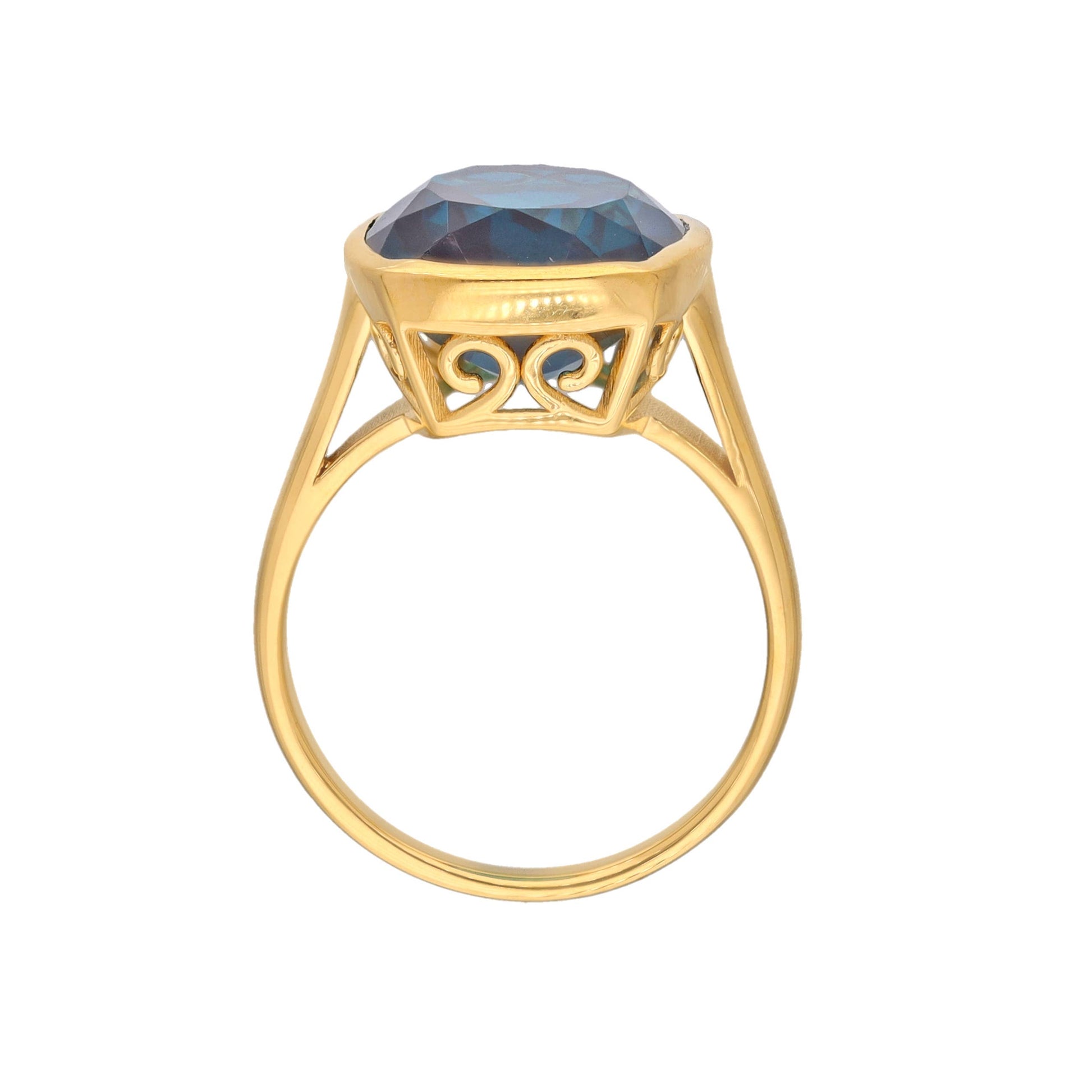 This ring is truly striking! It features a large, rectangular-shaped london blue doublet quartz gemstone with expertly cut facets that catch the light beautifully. The gemstone's vibrant hue contrasts elegantly with the polished gold band, creating a bold yet sophisticated design. Its simplicity enhances its luxurious appeal, making it a statement piece that could easily draw admiration.