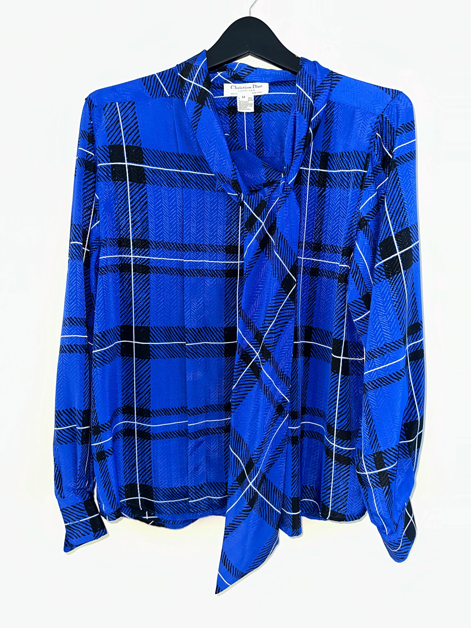 Vintage Christian Dior Blue Button Up Blouse with Tie Detail