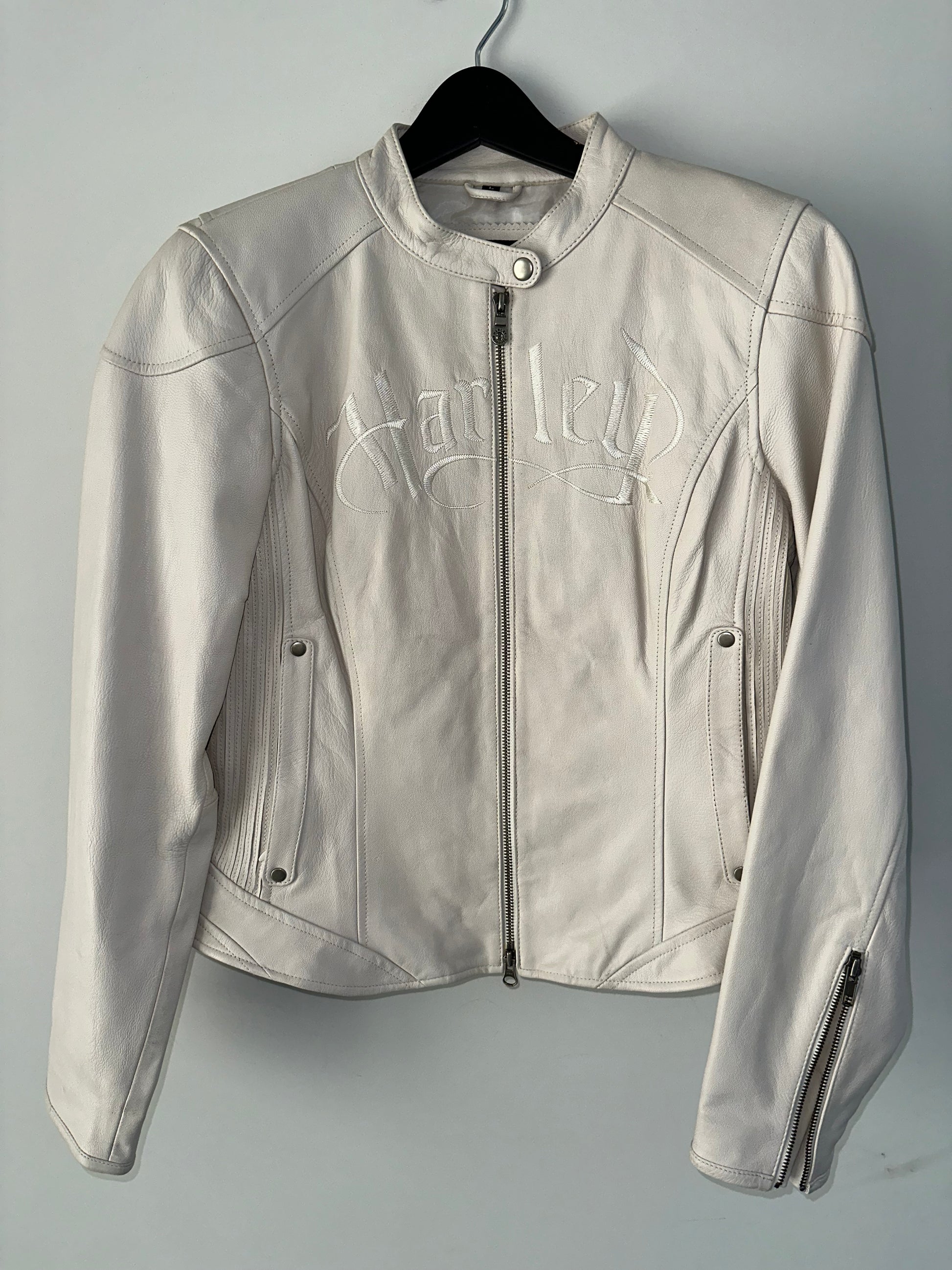 Vintage White Leather Harley Davidson Moto Jacket