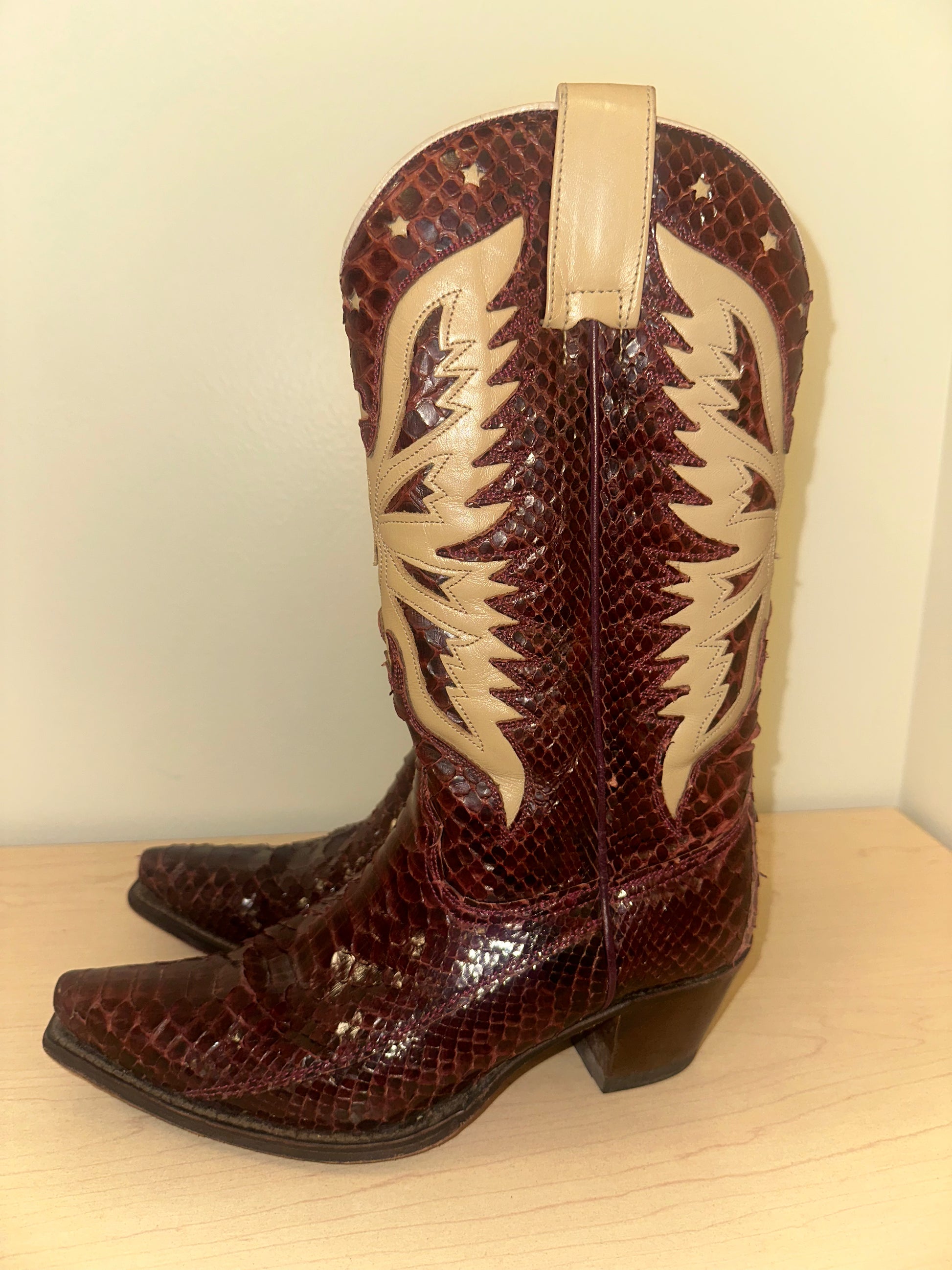 Vintage Maroon Snakeskin Cowboy Boots with Cream Detailing ft. Hearts